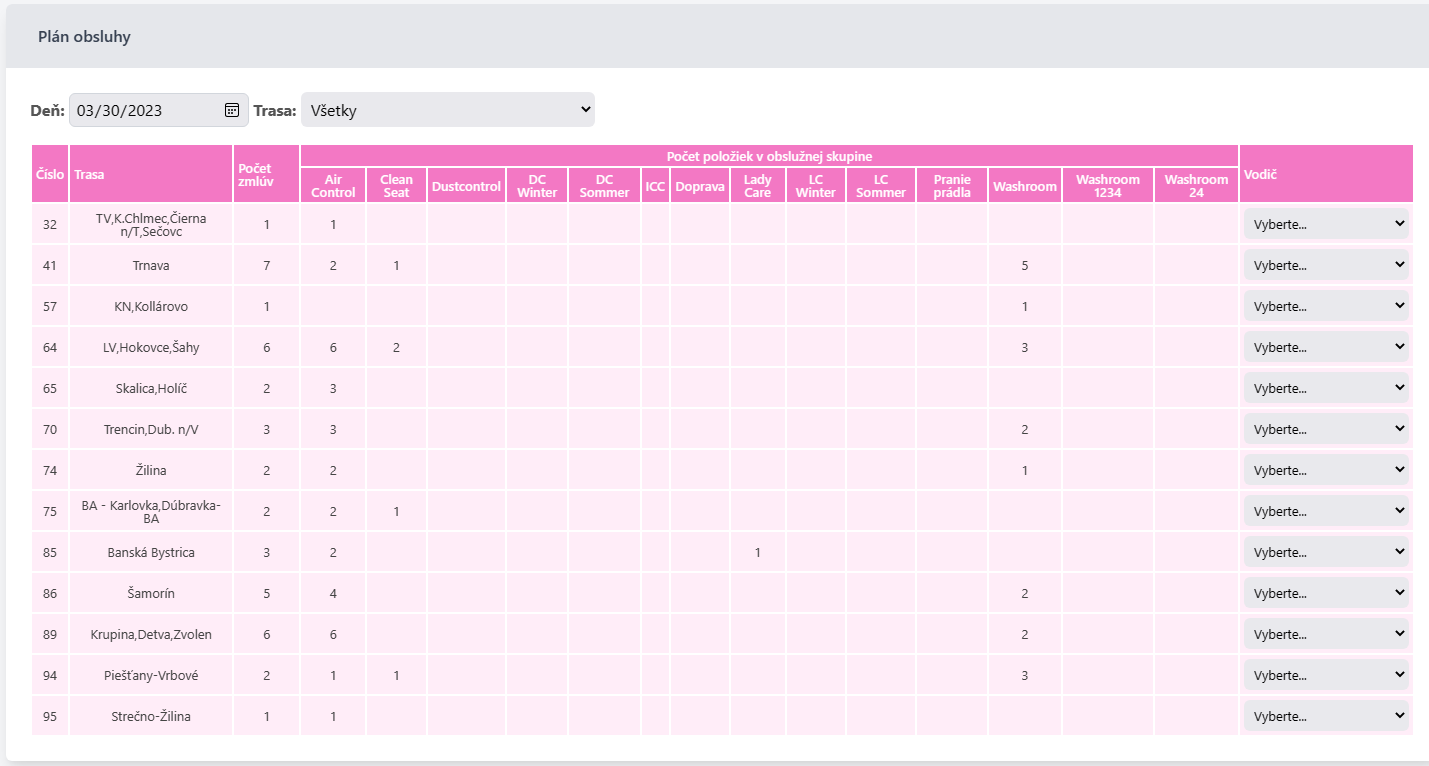 • Počet položiek v obslužnej skupine - jednotlivé položky určené pre danú trasu